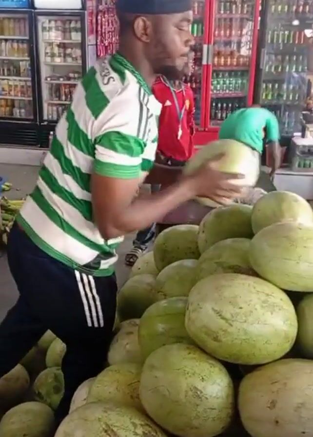 man in a green and white striped shirt picking watermelons. He is standing near a large pile of watermelons, looking them over and placing them on top of the pile. Other people are visible in the background, including a man in a red shirt and a man in a green shirt. A refrigerator with drinks is visible in the background, along with other items for sale. The video appears to be taken in a market or grocery store.