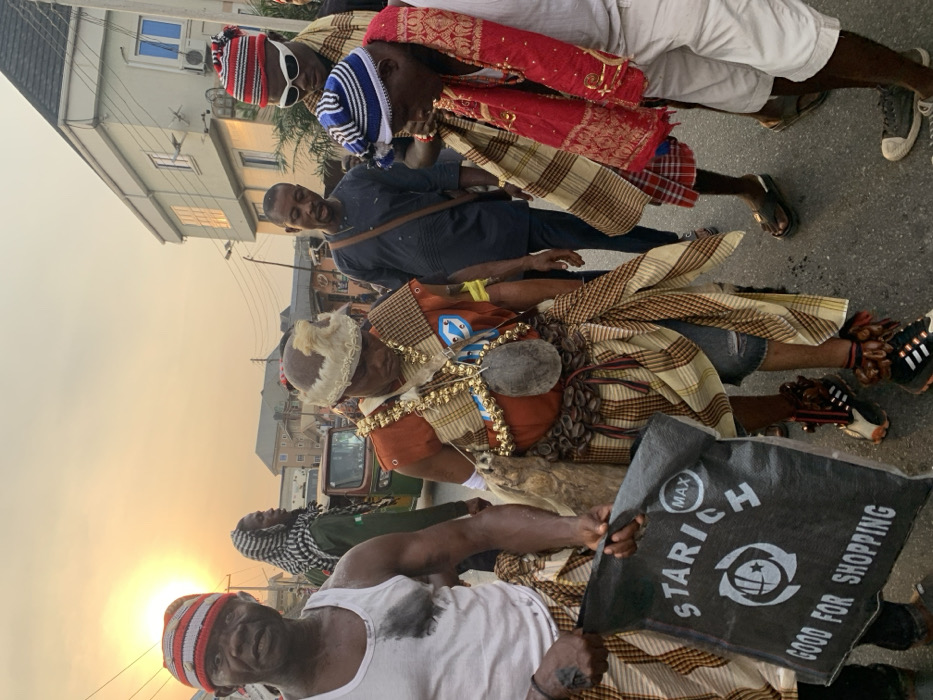 A group of men in traditional attire pose in a street scene. Garments include striped wrappers, headdresses, beaded necklaces, and ankle rattles. One man holds a black shopping bag with the word "STARICH" and the phrase "GOOD FOR SHOPPING" printed on it. A building and a vehicle are visible in the background, with the sun setting in the distance, creating an orange glow.
