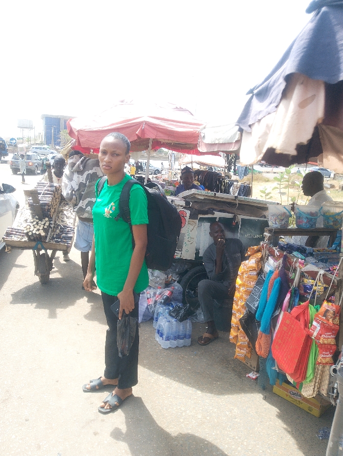 The image depicts a vibrant street scene in Kagini, Nigeria, characterized by market activity and vehicular traffic under bright daylight. In the immediate foreground, a young woman with dark hair pulled back stands facing the viewer, looking directly at the camera. She wears a green short-sleeved t-shirt with a logo on the left chest, black trousers, and light-colored open-toed sandals. She carries a black backpack and holds a black smartphone and a crumpled black plastic bag in her left hand. To her left, a man stands beside a two-wheeled wooden pushcart heavily loaded with numerous bundles of light-colored cylindrical objects, possibly sugarcane. He wears a patterned long-sleeved shirt and dark trousers. Further left, cars are visible on what appears to be a multi-lane road, with more vehicles and structures in the distant background. To the right of the foreground subject, a makeshift market stall is prominent, shaded by a large blue and beige tarp. Underneath, a man with dark skin, dressed in a dark long-sleeved shirt and dark trousers, sits on a low stool or box, eating something held in his right hand. The stall displays various merchandise, including stacks of clear plastic bottled water, several brightly colored small bags (red, orange, green, blue) hanging, and packaged snacks, specifically bags labeled "Chin-Chin." A dark tire and a "Gala" branded cardboard box are visible at the base of the stall. In the mid-background, multiple other market stalls with red and white striped umbrellas or tarps are visible, indicating an extensive market area. Distant figures and additional vehicles are discernible further down the road.