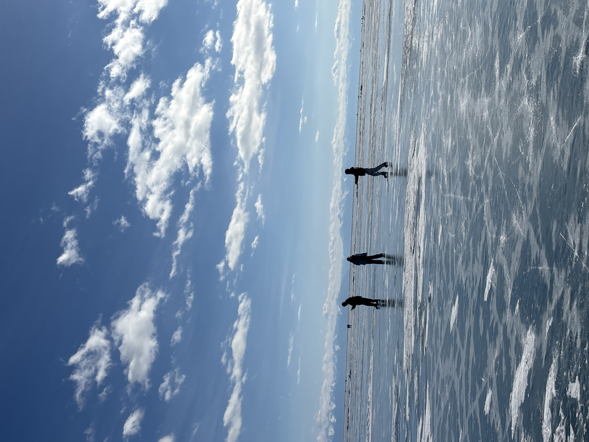 The image depicts a vast, frozen expanse of Lake Baikal near Listvyanka, Russia, under a clear blue sky with scattered white cumulus clouds. A continuous range of snow-capped mountains forms the distant horizon line. The ice surface, occupying the lower two-thirds of the frame, is largely clear and reflective with a bluish tint, showing intricate patterns of white, opaque ice and visible fissures. In the middle ground, three individuals are present. The leftmost figure, silhouetted in dark attire, wears ice skates and stands facing slightly right, looking down at a small handheld object. Adjacent to them, another individual in a blue jacket and dark pants stands. To the right, a third person in dark upperwear and light pants is actively ice skating, moving towards the right with arms slightly outstretched. Multiple smaller, indistinct figures are visible further out on the ice towards the horizon. The scene suggests recreational activity on the frozen lake during daylight.