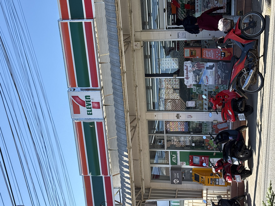 A tilted view of a 7-Eleven store. Multiple motorbikes parked outside, with people entering. Store signage includes the 7-Eleven logo, ATM signage, and window advertisements. Additional signage highlights the store's 24-hour service. A cluster of overhead power lines contrasts with the bright blue sky above the store.
