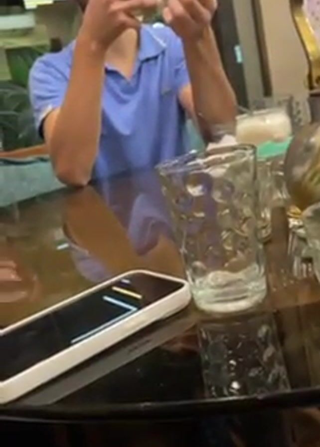 A person with glasses and a light blue shirt is holding a phone while sitting at a dark table