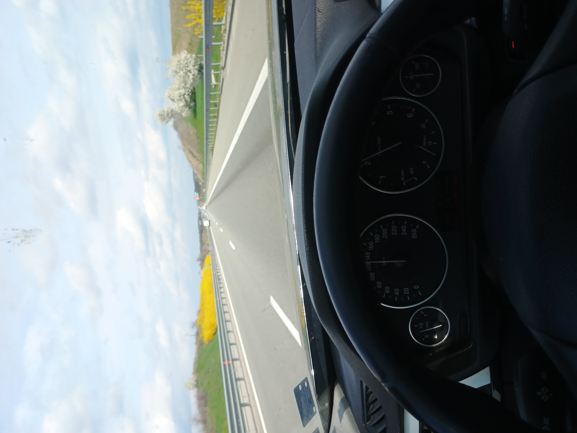 view from inside a car driving on a highway. The steering wheel and dashboard are visible in the foreground. The speedometer reads about 140 km/h, and the tachometer indicates around 3000 RPM. Through the windshield, a straight highway stretches into the distance. The landscape beside the road features a line of bright yellow flowers/bushes and some green grass, with a light blue sky overhead. The location is not discernible as being in Malko Tranovo, Bulgaria from the image alone.