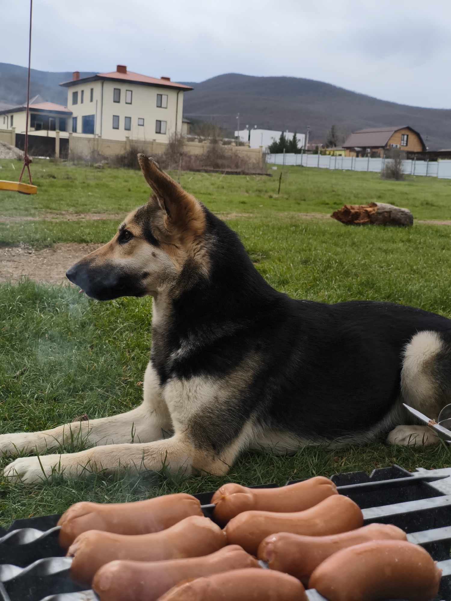 A medium shot captures a black and tan German Shepherd-like dog reclining on a grassy lawn with a backdrop of a residential area. In the foreground, a grill holds several uncooked sausages on skewers. Smoke rises faintly from the grilling area, possibly obscuring part of the dog’s face. Behind the dog and to the left, a two-story house with a red roof is visible, and further back are rolling hills or mountains under a cloudy sky. A wooden swing is partially visible on the left side of the image. In the right background, there is another house and a felled tree trunk. The scene appears to be set in a yard in the city of Орлиновский округ, Ukraine.