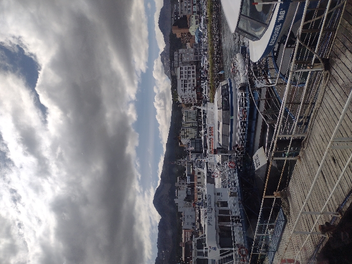 Boats are docked beside a pier constructed of wooden planks and metal railings. The city extends along the shore, its buildings rising toward the mountains under a cloudy sky. The boats vary in size, with some bearing names like "Rumbo Sur" and "Pta. Ushuaia." The foreground boats are labeled "Ezequiel 'MB'".