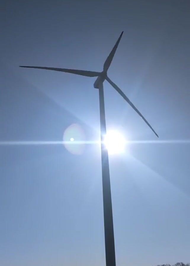 wind turbine from a low angle against a bright blue sky. The sun is directly behind the turbine, creating a strong solar flare effect. The wind turbine has three blades that are turning slowly. The turbine is situated in a green field, and there are other turbines visible in the distance. There is a line of trees on the horizon.
