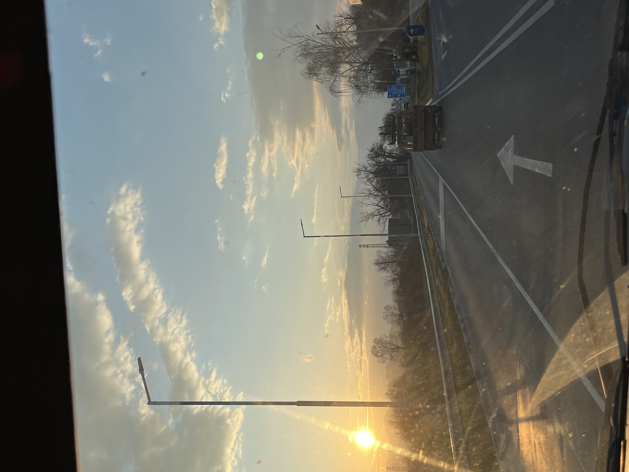 The image captures a roadside scene at sunset or sunrise in Anevo, Bulgaria, viewed from inside a vehicle through a windshield marked with dust or smudges. The sun, low on the horizon, is prominently positioned on the far left, emitting a strong golden light and distinct lens flares across the frame. The sky transitions from bright orange-yellow near the sun to light blue towards the upper right, adorned with scattered cumulus clouds displaying warm illumination from below. A notable green lens flare is visible in the upper right quadrant. The foreground features a paved, two-lane road with a clear white arrow painted on the asphalt, indicating a straight-ahead direction for the current lane. Double solid white lines define the right edge of the main road. A metal guardrail runs along the left shoulder of the road. Several dark-colored streetlights with horizontal luminaires are spaced along both sides of the road, extending into the distance. Ahead, on the road, a light-colored, older model utility truck or flatbed truck is observed traveling in the same direction. Its cargo bed appears to hold various items. To the right of the road, a large blue informational sign with white text is present, along with a smaller blue sign featuring a white arrow pointing right, indicating a turn-off. The environment adjacent to the road consists primarily of bare deciduous trees and shrubs, suggesting a late autumn or winter season. In the background, rolling hills or mountains are visible, partially silhouetted against the bright sky. Electrical pylons or utility poles can be seen in the middle distance to the left. No individuals are visible in the scene.