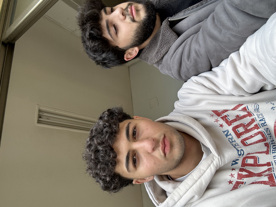 Two young adult males are present in an indoor setting. The specific location within Rukn ad-Din Municipality, Syria, is not discernible from the image. The male on the left is positioned closer to the viewer and is looking directly into the camera. He has dark, curly hair, light skin, and is clean-shaven. He is wearing a light-colored (off-white or light beige) hooded sweatshirt featuring a red and blue graphic design on the chest, which includes the word "WESTERN" and "EXPLOREX" along with stars and text elements. The male on the right is partially obscured by the male on the left and is looking to his right, away from the camera. He has dark, curly hair and a dark beard. He is wearing a grey jacket, possibly suede or a similar material, with a darker grey or black shearling-style collar. The background consists of a plain, light-colored ceiling, likely off-white or light grey, with a rectangular ventilation grille visible. To the upper right, part of a window frame or doorway is visible, suggesting an indoor environment with natural light present. No other objects or specific interactions between the individuals are evident.