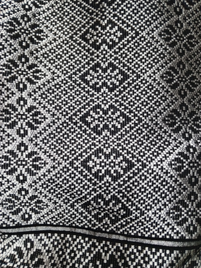 A detailed black and white fabric with a pattern reminiscent of woven diamonds and stylized flowers