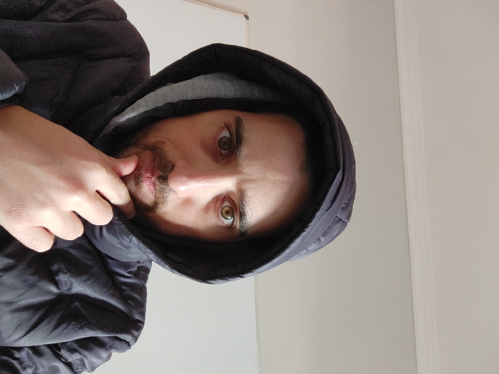 The image depicts a male individual captured in a medium shot, looking directly into the camera. He wears a dark, possibly navy or black, hooded puffer jacket over a grey hooded sweatshirt, with both hoods pulled up. He has a beard and mustache. His eyes display heterochromia; the left iris appears brown, and the right iris appears green-yellow. His right hand is positioned with fingers resting against his chin and lower lip. The background is a plain light-colored wall, with a partial white board visible on the left. A white ceiling with decorative molding is present at the top of the frame. The scene is an indoor setting in the city of Tel-Aviv, Israel.