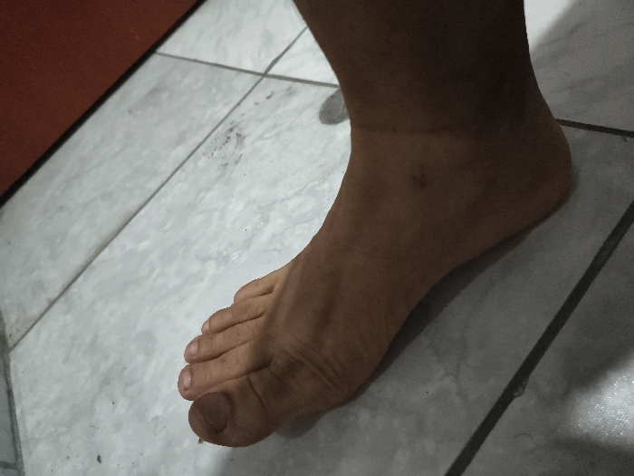 A bare human left foot with medium brown skin tone is positioned on a tiled floor