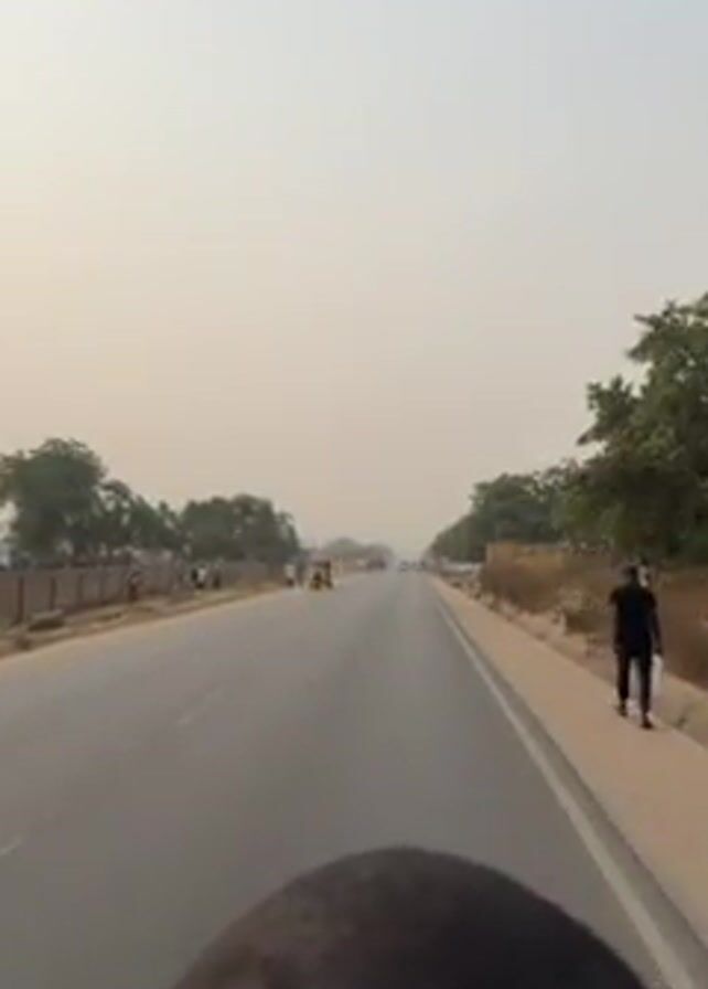 view from a moving vehicle traveling on a highway under a hazy sky. There are trees and vegetation on both sides of the road, and a concrete barrier separating the road from the shoulder on the right. On the left side of the road, a silver sedan is parked near a group of people. Further down the road, a yellow auto rickshaw is visible along with a few other vehicles. Two motorcycles pass in the same direction as the camera. The focus of the foreground is the top of the head of the person holding the camera.
