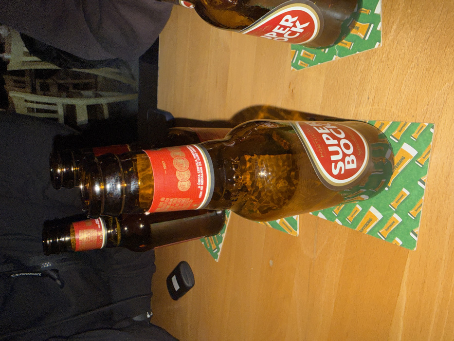 - "Three Super Bock beer bottles lay horizontally on a wooden surface" by FM-sHh6Q2, licensed under CC BY 4.0