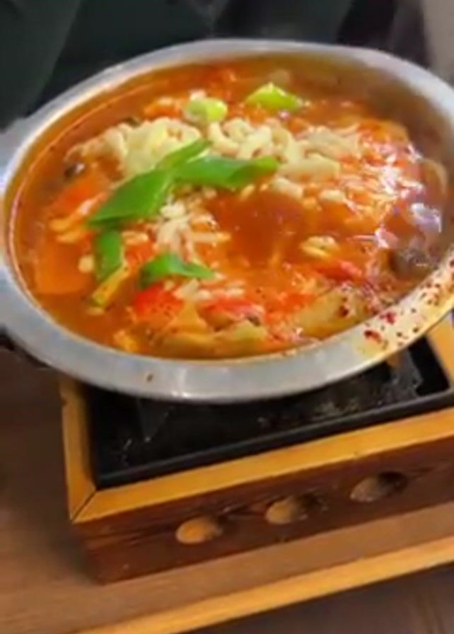 A close-up video shows a hot, bubbling dish, likely a stew or soup, in a silver bowl