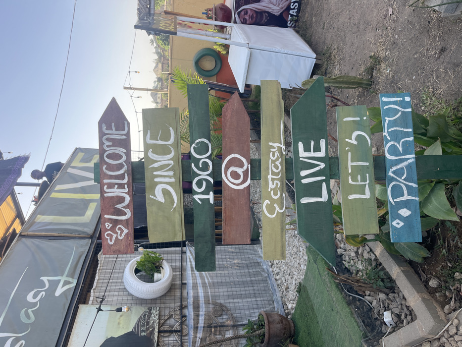 An outdoor scene in Bar Jirgi Summa, Nigeria, features a central, multi-directional wooden signpost. The signpost has a vertical dark green pole from which eight horizontal, arrow-shaped wooden planks extend, painted in various colors. From top to bottom, the planks read: "WELCOME" (brown, right-pointing, with two small hearts), "SINCE" (light green, left-pointing), "1960" (dark green, right-pointing), "@" (light brown, left-pointing), "Ecstasy" (light green, right-pointing), "LIVE" (dark green, left-pointing), "LET'S!" (light green, right-pointing), and "PARTY!" (blue, left-pointing, with diamond symbols). In the upper left background, part of a building is visible with a light-colored banner displaying "Ecstasy" and another banner underneath reading "LIVE". A person in a dark shirt is partially visible on the rooftop above these banners. String lights with bare bulbs hang horizontally. A white car tire, repurposed as a planter with green foliage, is affixed to a wire mesh fence. Below, a terracotta pot holds a green plant on a bed of light-colored gravel, adjacent to a strip of artificial green turf. To the right of the signpost, a white, fabric-covered kiosk-like structure stands on bare earth. Attached to or near this structure is a poster featuring the face of a woman, possibly wearing a headscarf, with the word "ECSTASY" visible below her image. Further back, a dark green tire leans against a wall. The ground on the right consists of exposed dirt, with some green vegetation, possibly a cactus, present. The scene is brightly lit under a clear blue sky, with distant residential structures visible on the horizon.