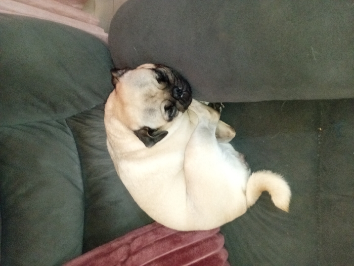 - "Within an indoor domestic setting in El Valle del Espíritu Santo, Venezuela, a fawn-colored pug dog is depicted curled on its left side, appearing to be at rest or asleep" by FM-2WF963, licensed under CC BY 4.0
