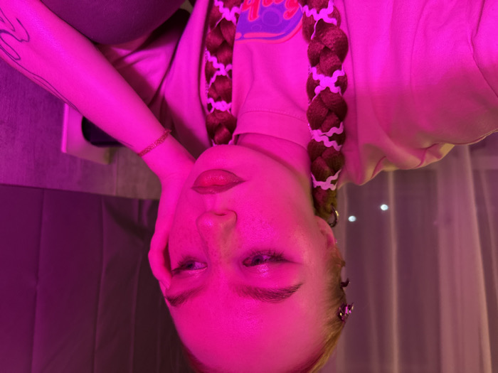 An individual is depicted indoors in Chaikovsky, Russia, bathed in strong magenta artificial lighting. The subject is a young female with reddish hair, styled in two long braids featuring white zig-zag patterns. She wears multiple small, decorative clips near her left temple. Her left hand rests against her cheek, supporting her head, and a thin red string bracelet is visible on her left wrist. A black linear tattoo is present on her left forearm. She wears a light-colored top beneath a darker garment, with a brown and white patterned element, possibly a tie, visible near her neck. Her eyes are accentuated with dark eyeliner, and her lips are colored with dark lipstick. She appears to be looking downwards and to her right. In the background, a sheer curtain partially covers a window on the left, through which two distant white lights are visible. To the right, a dark, textured wall paneling is present.
