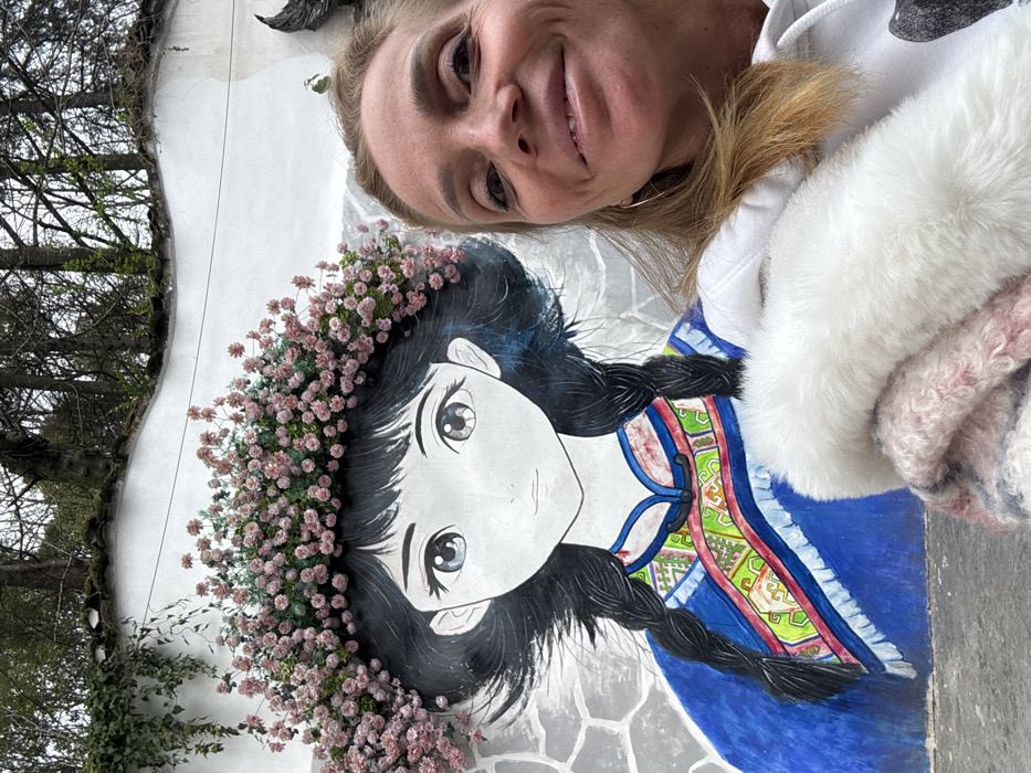 A selfie photograph taken in Furong, China, features an adult female positioned on the right side of a large mural
