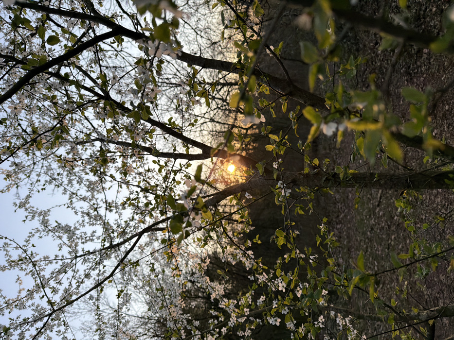The image displays an outdoor scene at sunrise or sunset in Schifflange, Luxembourg. The foreground and midground are occupied by multiple deciduous trees with dark trunks and branches. These trees are in bloom, heavily covered with small, white five-petaled blossoms and sparse light green leaves. The sun, a prominent circular light source, is visible through a gap in the central branches, producing a warm orange glow and distinct lens flares. The background consists of silhouetted, bare tree branches against a gradient sky, transitioning from pale blue at the top to a warm orange-yellow near the horizon. The ground beneath the trees is dark brown, consistent with natural earth or dried foliage. No human subjects or artificial structures are present.