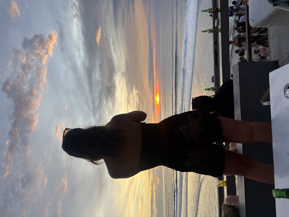 The image depicts an outdoor, multi-level beach club or bar venue overlooking the Indian Ocean during sunset in Uluwatu, Indonesia. The central subject, viewed from behind, is a female with shoulder-length dark hair, wearing a dark strapless top and dark crochet-knit shorts. Sunglasses are perched on top of her head. She stands facing west, observing the sunset where the sun, appearing as a bright orange orb, is positioned just above the horizon line of the ocean. The sky displays a gradient of orange, pink, and grey clouds, with brighter yellow hues near the horizon. Below the main subject, a concrete or dark-colored railing separates her level from a lower outdoor area. On this lower level, several green beer bottles (likely Bintang brand, visible from their star logo) are arranged on a surface, along with other patrons. Another person, partially visible and silhouetted in dark attire, sits at a table to the right of the main subject on her level. On the far left, another partially visible person sits at a table with a yellow-tinted drink. In the foreground, a white table surface is visible with a green bottle and an aluminum can. Further down, multiple individuals are visible in a more crowded, open-air section of the venue, some standing, some seated. The ocean features moderate waves breaking near the shore, reflecting the sunset light.