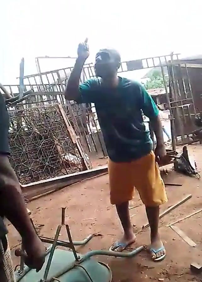 three men in an outdoor setting. One man, wearing a blue-green shirt and yellow shorts, is standing and pointing emphatically. Another man, wearing a black shirt and plaid shorts, is holding a wheelbarrow that is lying upside down. A third man, wearing a red and black shirt, is positioned near the wheelbarrow. The background includes a metal structure, various metal objects, and dirt ground. The scene appears to be a work area or yard.