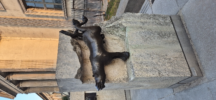 An outdoor sculpture installation is depicted in the courtyard of the Musée Rodin, Paris, France. The central subject is a dark bronze sculpture of a stylized, contorted animal, resembling a horse, embedded within a tall, roughly textured concrete block. The animal's head is positioned to the left, mouth open, while its body extends horizontally before its rear limbs curve upwards and backwards, integrating into the jagged concrete cutout. The concrete block rests on a narrow metallic base plate, situated on light gray paving stones. In the background to the left, a large classical building features several fluted columns and a prominent cornice, illuminated by warm, natural light from a clear sky. To the right, the building's facade shows a plain section, a vertical decorative element, and a multi-paned window behind a dark, vertical iron fence that separates the foreground from a slightly elevated grassy area.