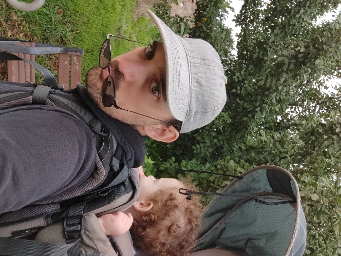 - "An outdoor scene in Rosh HaAyin, Israel, depicts an adult male carrying a young child on his back in a baby carrier" by FM-3Ip2o1, licensed under CC BY 4.0