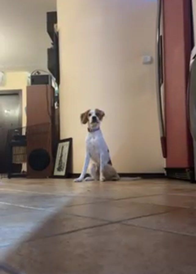 A white and tan Brittany spaniel dog sits patiently on a brown tiled floor, looking directly at the camera. The dog stands and walks towards the camera, tongue hanging out, panting. In the background, there's a partial view of a room with beige walls, a brown cabinet, a black metal pet crate, a picture frame, and a red refrigerator. The room is illuminated by overhead lighting. The camera is positioned low to the ground.
