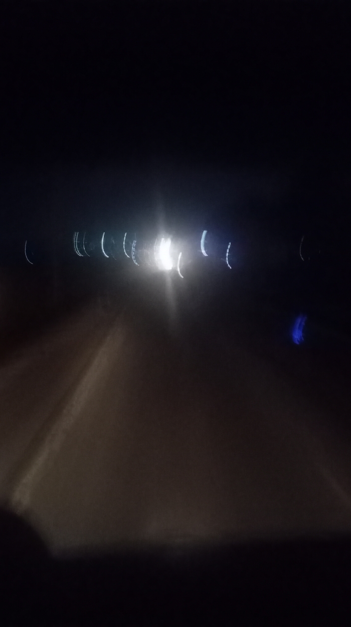 A blurry night scene features bright headlights of an approaching vehicle. Streaks of light illuminate the dark asphalt road. Two vertical streaks suggest lane markings. Dark surroundings and a black foreground create a sense of depth. A possible tail light shows blue, adding a detail on the right side of the image.