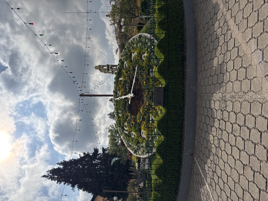The image displays a daytime outdoor scene featuring the prominent floral clock in a public park or plaza in Zacatlán, Mexico