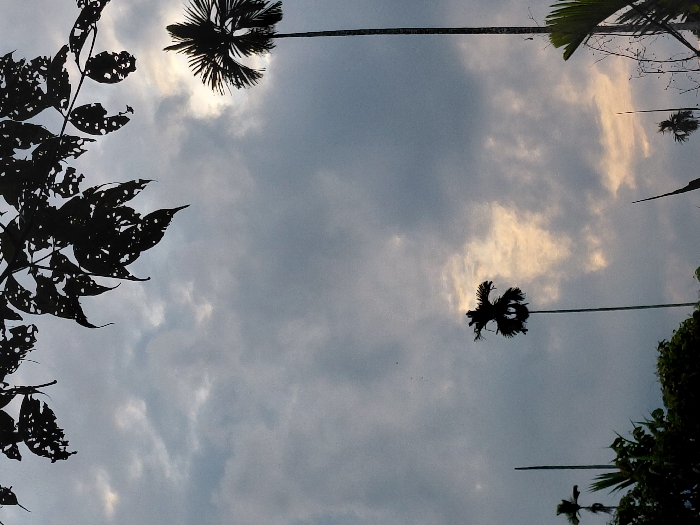 The image displays an outdoor natural environment in Keude Cunda, Indonesia, under an overcast sky. The sky is characterized by varying shades of gray clouds, interspersed with luminous patches of yellowish-white light, suggesting either sunrise or sunset. Dominating the upper frame are dark, silhouetted tree branches with numerous holes and irregularities in their leaves. Below this, multiple tall, slender palm trees, consistent with Areca palms, are silhouetted against the sky. One prominent palm stands on the right, and another is positioned in the center-left. Additional dark vegetation and several thin, vertical plant structures are visible in silhouette along the bottom of the frame. There are no individuals, animals, or man-made objects discernible within the scene, nor are any specific actions or interactions depicted.