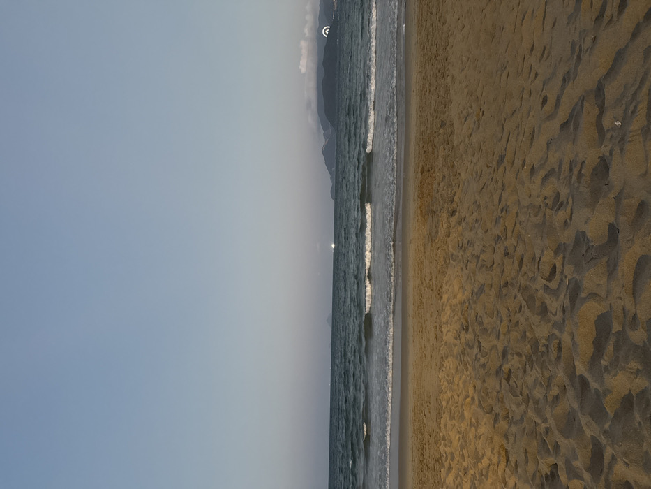 The image displays a panoramic beachfront scene in Nha Trang, Vietnam, observed during either dawn or dusk. The foreground is occupied by a broad expanse of light brown sand, exhibiting numerous undulations and depressions on its surface. Directly beyond the sand, the ocean features several parallel lines of small, white-crested waves gently breaking as they approach the shore. The water itself is a dark blue-green. The horizon line clearly separates the ocean from a pale blue sky. In the distant background, a dark, mountainous landmass is visible on the right, extending towards the sea and partially veiled by atmospheric haze. Several distinct bright artificial lights are scattered across the distant water and along the base of the distant mountains, with one prominent arc-shaped light identifiable on the far right coastal area. No individuals or identifiable man-made objects are present on the immediate beach or in the surf.