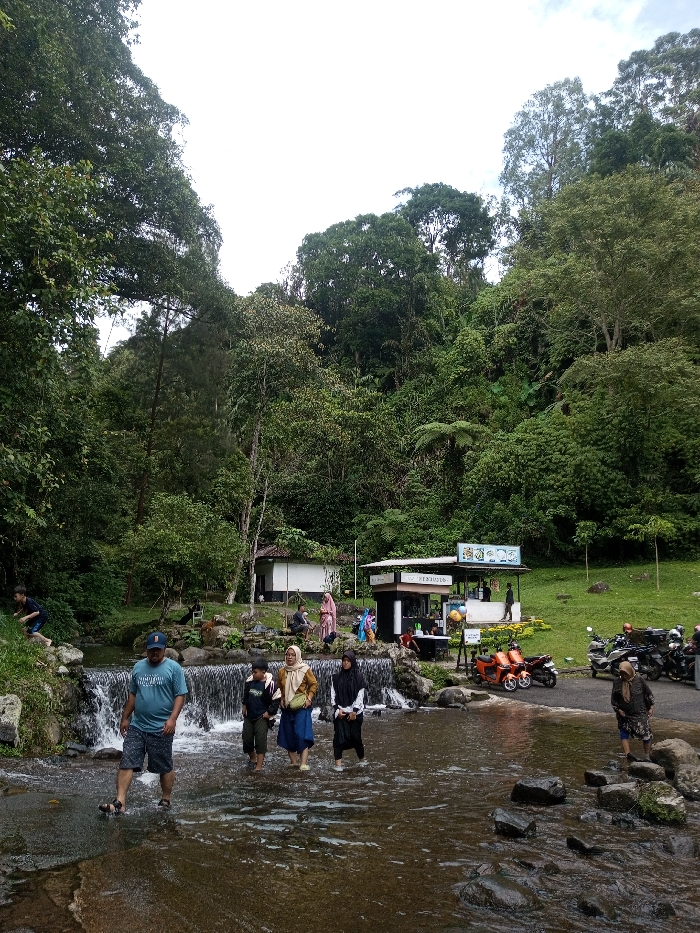 The image portrays an outdoor scene in the city of Kanand, India, featuring a shallow, rocky stream flowing through a heavily forested natural environment under an overcast sky. In the foreground, a man wearing a blue t-shirt and dark patterned shorts, with sandals in hand, walks barefoot through the stream, facing slightly right. To his right, a group of three individuals also wade barefoot through the water: a young boy in a dark t-shirt and shorts, followed by a woman in a light brown hijab, yellow-brown top, and blue skirt, and then a girl in a black hijab, white top, and black pants. Further right, an older woman with a light head covering and patterned clothing stands barefoot in the water near the stream's edge. Mid-ground details include a man-made weir creating a low waterfall across the stream. On the right bank, a black-colored kiosk with a white sign, displaying text including "PERBUMOTO," is visible on a paved area. The kiosk is adorned with colorful signs and decorations. Several motorcycles, including two prominent orange scooters, are parked on this paved surface. Behind the kiosk, a grassy slope extends upwards towards the dense forest. On the left bank of the stream, a small, white-walled building with a dark roof is situated among the trees. Near this building, several individuals are seated or standing on rocks and a low wall, including a woman in a pink dress and light head covering. On the far left, a young boy in a blue shirt and dark shorts is seen on a grassy incline beside the stream. The background is dominated by a lush, dense forest of tall, green trees, indicating a mountainous or hilly terrain. The sky is largely white with visible cloud cover.