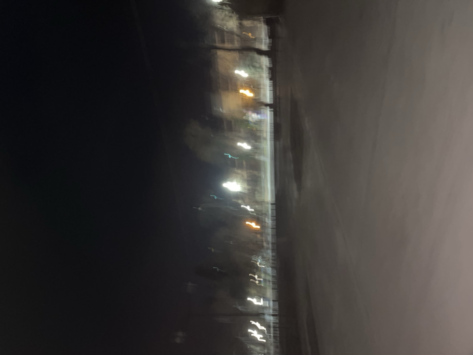 The image depicts a nighttime urban scene in Stara Zagora, Bulgaria, characterized by significant motion blur and low light. The foreground consists of a wide, flat, dark-toned paved surface, possibly asphalt or concrete, with several darker, irregular patches that may indicate puddles or depressions. No individuals or distinct objects are present on this surface. A faint, horizontal line extends across the midground, separating the immediate foreground from a row of indistinct, dark vertical elements, potentially fencing, bollards, or small benches. Behind this, a blurry linear feature suggests a path or roadway. The background is dominated by numerous streaked light sources, comprising both bright white/blue and orange/yellow illumination, consistent with streetlights and potentially building lights. These lights exhibit noticeable "S" or wave-like distortions due to camera movement. Dark, amorphous shapes consistent with trees or bushes are discernible behind the lights and the linear feature. Faint, dark, rectangular structures in the far background indicate the presence of buildings. The overall environment appears deserted, with no discernible human activity or specific interactions.