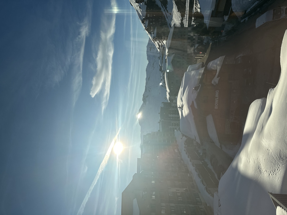 A high-angle perspective depicts a snow-covered alpine town in Saint-Martin-de-Belleville, France, under a bright blue sky with scattered cirrus clouds and a single contrail. The low sun generates substantial lens flare and long shadows across the scene. Multiple multi-story alpine buildings, featuring pitched roofs, are densely covered in snow. A prominent building in the mid-ground, identified by "BOWLING" signage on its facade, exhibits a heavy snow load on its roof. A dark, human-like figure, resembling a person on skis, is positioned on the snow-covered roof of the "BOWLING" building. A winding, partially cleared roadway traverses the urban environment, with vehicles present. Snow-covered mountain peaks are visible in the background, exhibiting sun reflections.