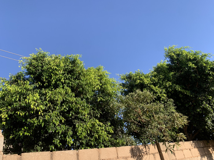 The image depicts an outdoor scene in Gura Top, Nigeria, under a clear, bright blue sky that occupies the upper portion of the frame. The middle and lower sections are dominated by dense green foliage from several trees and a light-brown brick wall. Two prominent trees with vibrant green leaves are visible, one on the left with uniform, smaller leaves, and another to the right with darker, larger foliage. A third, smaller tree or large shrub with lighter green leaves and visible brown branches is situated towards the center-right, above the wall. Two thin utility lines are visible in the upper-left quadrant, crossing diagonally through the sky and partially obscured by the tree canopy. The top course of a light-brown block-constructed wall, possibly a perimeter fence, runs horizontally across the bottom of the image. The scene is brightly lit by direct sunlight, creating subtle shadows on the wall from the vegetation. No people, animals, or explicit actions are present.