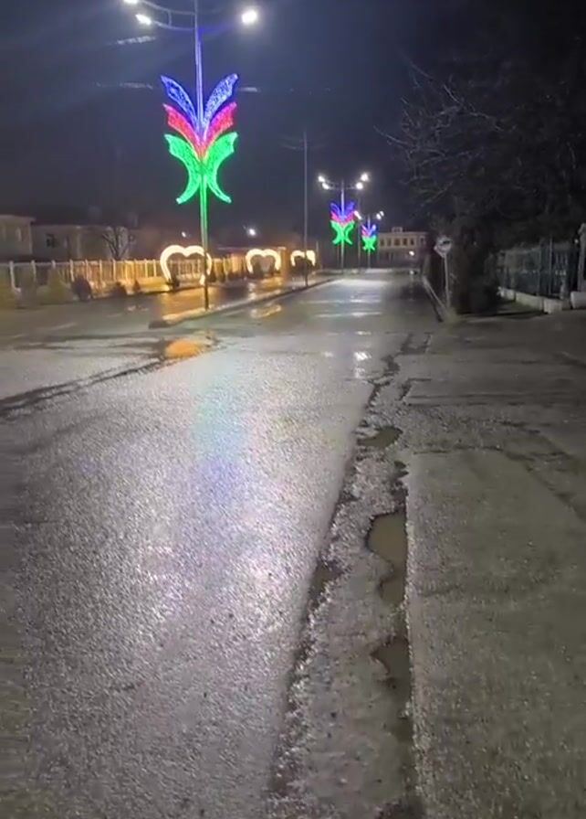 dark street at night after a rainfall, reflected by the wet pavement. The street is lined with streetlights, some decorated with brightly colored, stylized floral designs and heart-shaped lights. The camera moves forward, showing the crosswalk with yellow and white stripes. The video then points up at a very bright streetlight before going black.