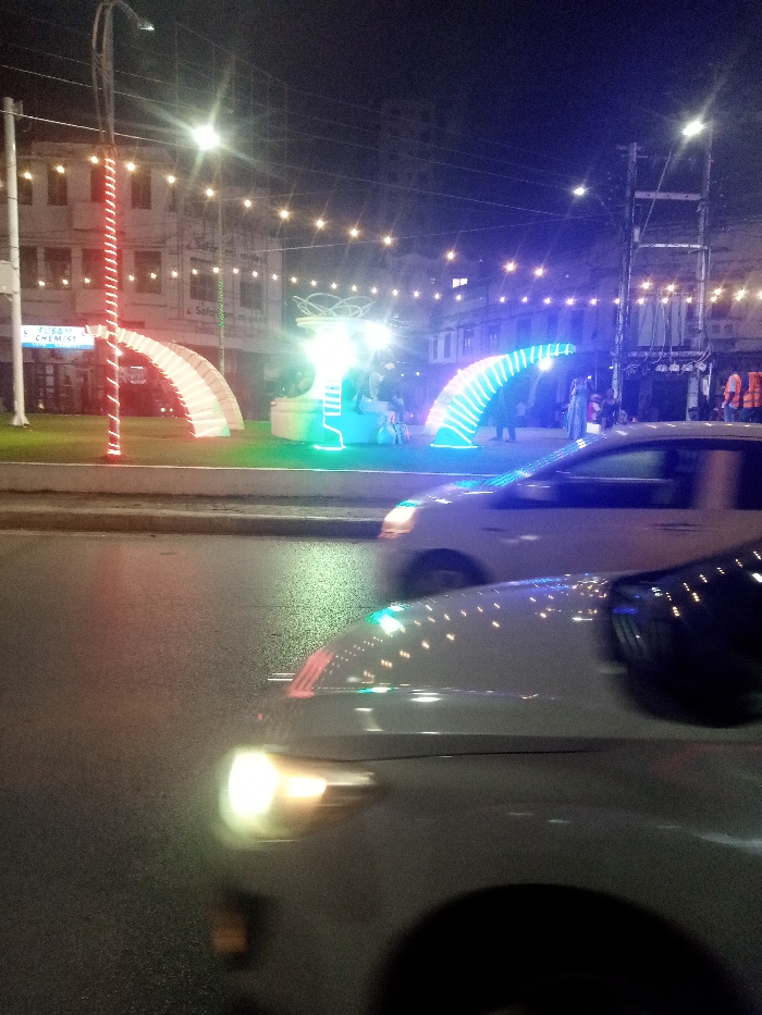 The image depicts a nighttime street scene in Majengo ward, Kenya, characterized by urban illumination and vehicular traffic. In the foreground, two light-colored vehicles are in motion on a wet asphalt road, showing blurred headlights and reflections of overhead lights on their hoods. The closest vehicle, partially visible at the bottom, displays a bright white headlight. A central median or island separates the road from the background buildings. This median features several illuminated decorative elements: a tall pole wrapped in red string lights on the left, followed by two white, arch-like structures. To their right, a brightly lit central monument or sculpture glows predominantly green and white, with swirling elements at its apex. Adjacent to this, a blue LED-lit arch structure is visible. Several indistinct individuals are present on the median, appearing to be observing the lights; one person near the blue arch wears an orange safety vest. In the background, multi-story buildings line the street, some with illuminated windows. Visible signage includes "FUSANI CHEMIST" and "Safcom m-pesa." Overhead, warm-toned string lights are strung across the street, contributing to the ambient illumination. Utility poles and power lines are also evident against the dark sky. The overall environment is an active urban area at night, enhanced by decorative lighting.