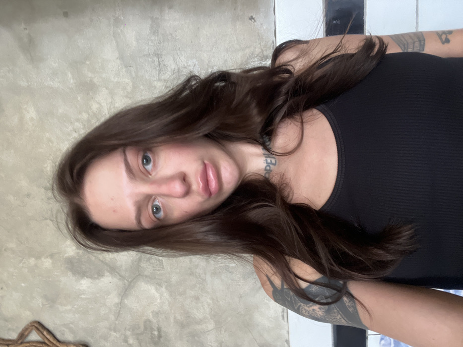 A woman with long, dark brown hair poses for a photo. She wears a black tank top. She has fair skin, blue eyes, and full lips. Tattoos are visible on her upper chest and arm. The background appears to be a concrete wall and some sort of blue and white tile. The photo is taken at an angle, with the woman's head tilted.