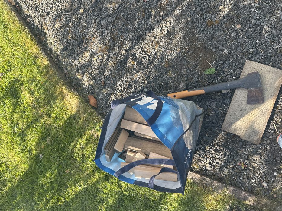 blue and white bag filled with wooden planks, lying on a gravel path near a wooden plank and an axe with an orange handle