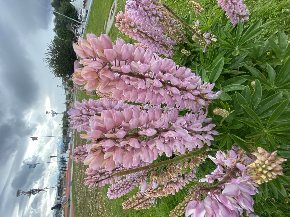 A cluster of vibrant pink lupine flowers dominates the foreground, their blooms densely packed on upright stems amidst lush green foliage. Behind the flowers, a blurred cityscape fades into the background under a cloudy sky. Flags flutter in the distance near parked vehicles and buildings, adding depth to the scene. The overall impression is of a vibrant display of nature set against a muted urban backdrop.