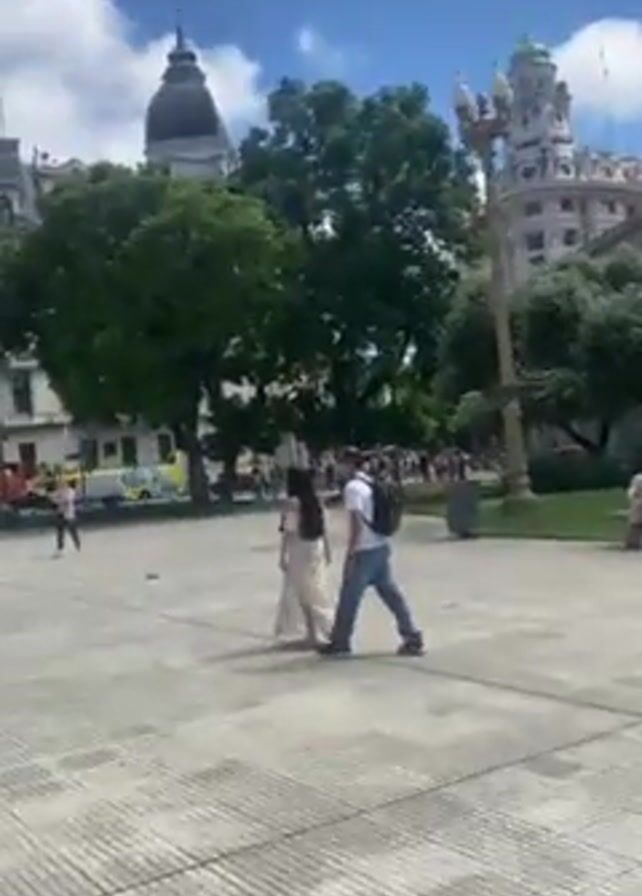 sunny day in a public square with several buildings around the perimeter. The sky is blue with puffy white clouds. There are people walking around the square, some in pairs and others alone. There are trees providing shade in some areas. The ground is paved with light-colored tiles arranged in a grid pattern. Several buildings are visible, including a white building with a clock tower, a tall building with the words "BANCO COMAFIASA" on it, and another ornate building with a dome.