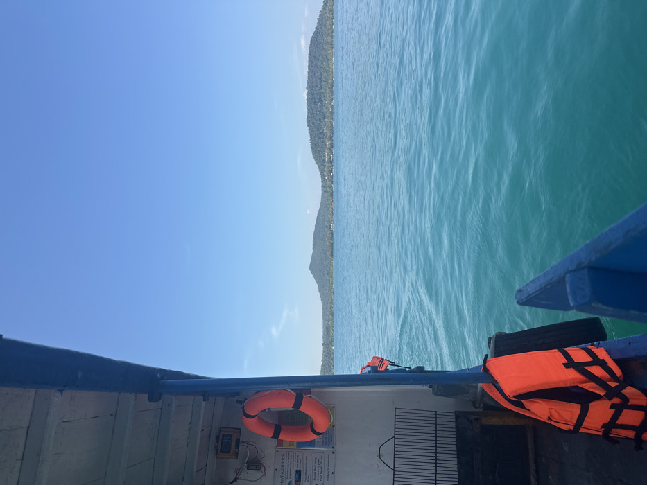 From a boat, a clear sky meets a teal ocean. In the distance, a green, hilly coastline separates sky and sea. The boat's interior is visible with a white wall, blue trim, and orange safety equipment attached. A life ring and life vest are prominent. The boat appears to be moving through calm water.