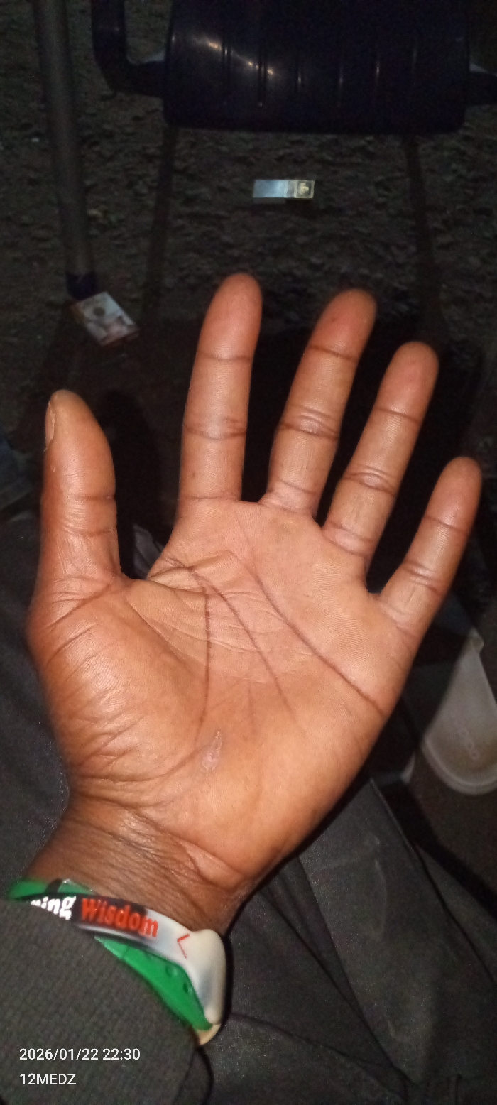 A person's open hand, palm-up, fills the frame, showcasing prominent lines and creases