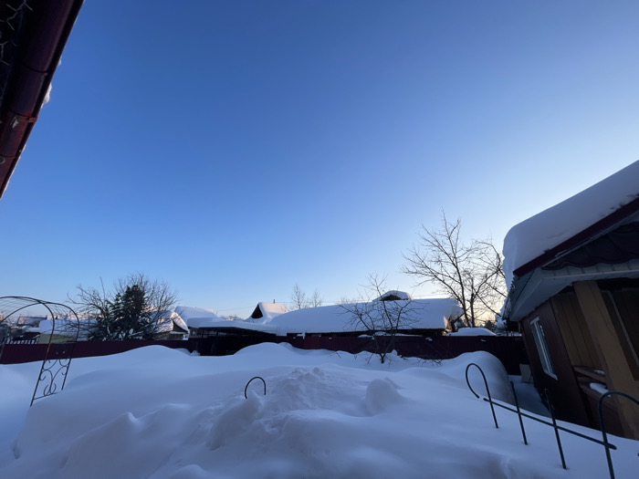 - "This image depicts a deeply snow-covered residential backyard in Zav'yalovo, Russia, under a clear, bright blue sky, indicative of a cold, sunny winter day, likely during early morning or late afternoon" by FM-NoKcg2, licensed under CC BY 4.0
