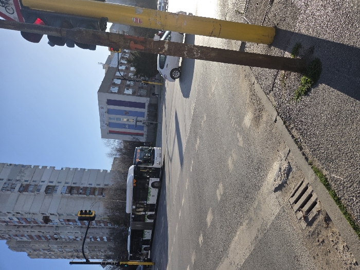 The scene depicts an urban intersection in Sofia, Bulgaria, located near the University of National and World Economy in Studentski Grad. It is daytime under a clear blue sky, with bright sunlight casting prominent shadows. In the immediate foreground, a weathered asphalt road surface exhibits faded white lane markings and square-shaped indentations. It adjoins a gravelly sidewalk, separated by a concrete curb. A metal storm drain grate is situated within the curb. A rusty brown metal pole supporting a traffic light, which displays a red signal, stands on the sidewalk. Adjacent to it is a bright yellow pole. Sparse green vegetation grows at the base of the rusty pole and along the curb. In the midground, a white articulated public transit bus, identified as MAN and displaying route number "76," is stationary at the intersection with its front door open. Behind the bus, a white compact sedan is also stopped. A second traffic light, indicating a yellow signal, is visible suspended over the intersection to the left of the bus. The background features a tall, multi-story concrete residential building on the left, characterized by numerous balconies. To its right, a smaller institutional building displays large vertical red, white, and blue banners on its facade, identifying it as the University of National and World Economy. Bare trees are visible between these structures. A single individual is discernible walking on the sidewalk adjacent to the university building.