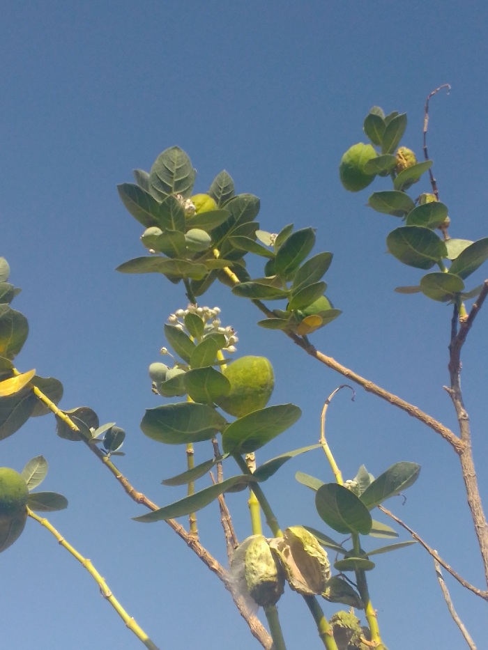 The scene depicts a Calotropis procera plant captured from an upward angle against a clear, uniform blue sky in an unidentifiable location within Unknown, Unknown