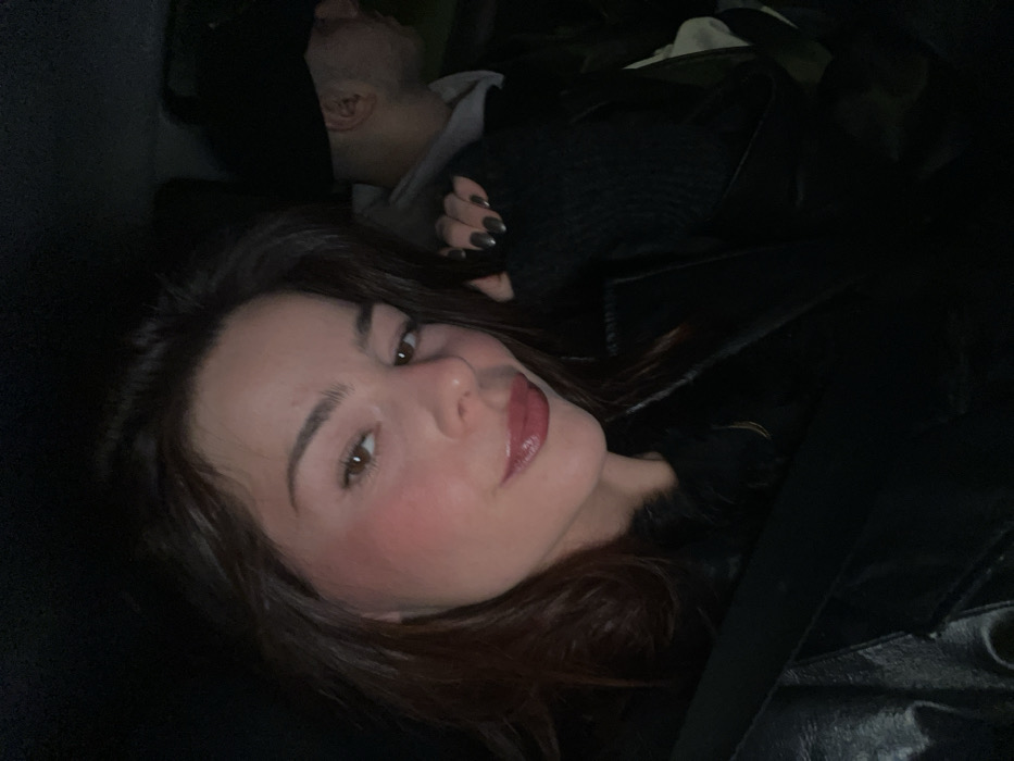 A brunette woman with red lipstick looks directly at the camera. She wears a black leather jacket and has a seatbelt strap across her chest. Behind her, a man wearing a dark cap and gray sweatshirt lies with his face turned away. One of his hands is visible with dark nail polish. The scene is dimly lit.