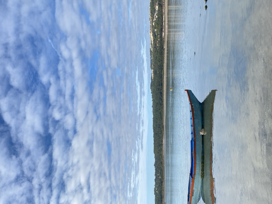 The image displays a panoramic view of the Obidos Lagoon, situated near Caldas da Rainha, Portugal. In the lower-midground, a light blue wooden boat, approximately 4-5 meters in length, is floating in calm, shallow water. The boat has an orange-red trim along its gunwales. The word "J6YPES" is painted on its port side near the stern, and "PENKICHE" (likely "PENICHE") is visible closer to the bow. A white cylindrical float or buoy is tethered to the boat's port side at the waterline. The boat casts a clear reflection on the still water. Two small yellow buoys are present further out in the mid-ground water. The background reveals the opposite bank of the lagoon, characterized by undulating hills covered with dense green vegetation, predominantly trees. Scattered light-colored structures, indicative of buildings, are visible on the distant slopes above the tree line. The sky, which occupies the upper half of the image, is light blue with extensive coverage of scattered white, stratocumulus-like clouds. A faint contrail is discernible in the upper right portion of the sky. No individuals are visible in the scene.