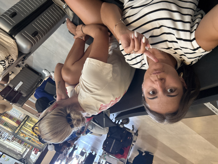Two women are sitting at an airport. One woman is blonde and wearing a white t-shirt. She has a tattoo on her arm. The other woman is wearing a black and white striped shirt and has dark hair. They are surrounded by luggage. One woman is pointing at the camera. There is a store in the background. The picture has been rotated.